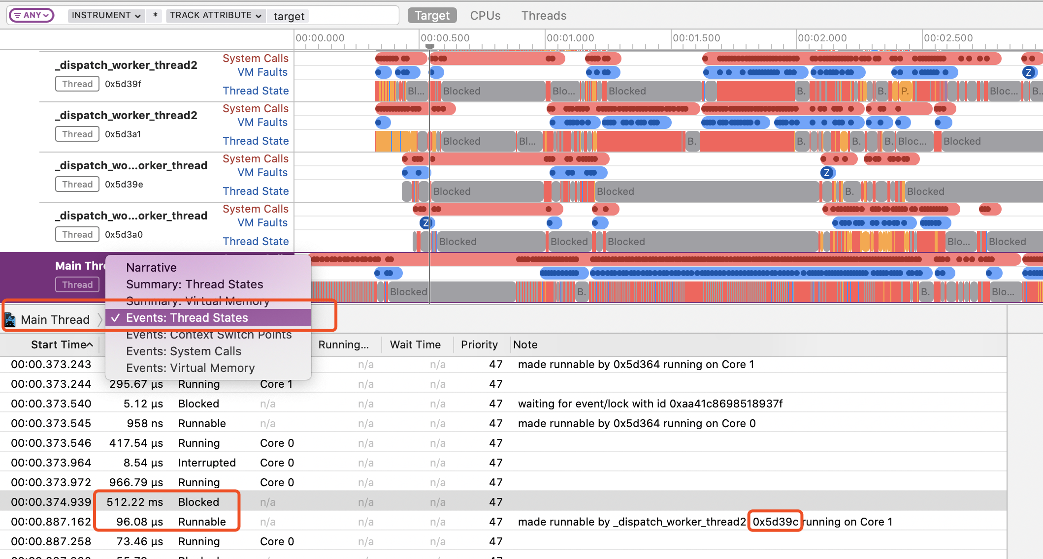 可以看到主线程有段时间被阻塞住了,存在一个互斥锁,切换到 Events:Thread State观察阻塞的下一条指令,发现0x5d39c 执行完成释放锁后,主线程才开始执行。