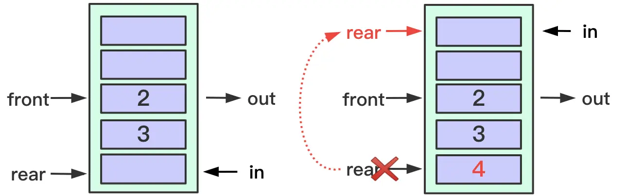 - 顺序队列之前的数组存储空间将无法再被使用,造成了空间浪费;