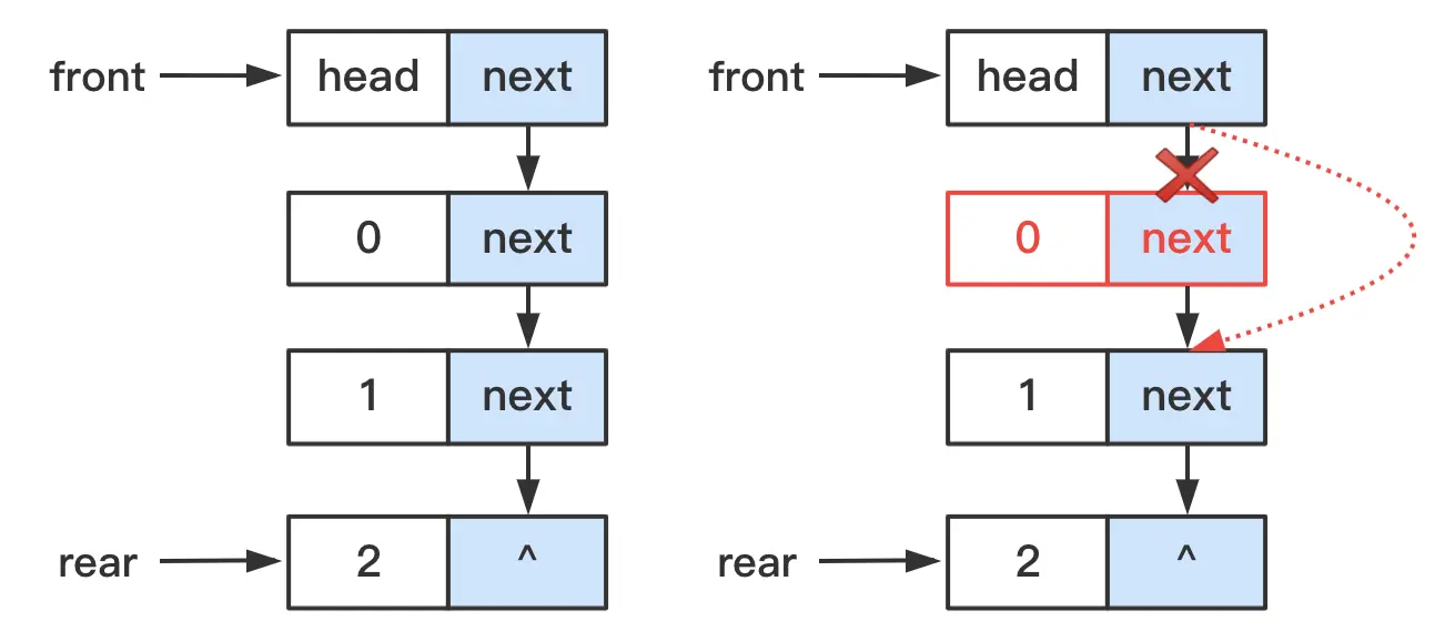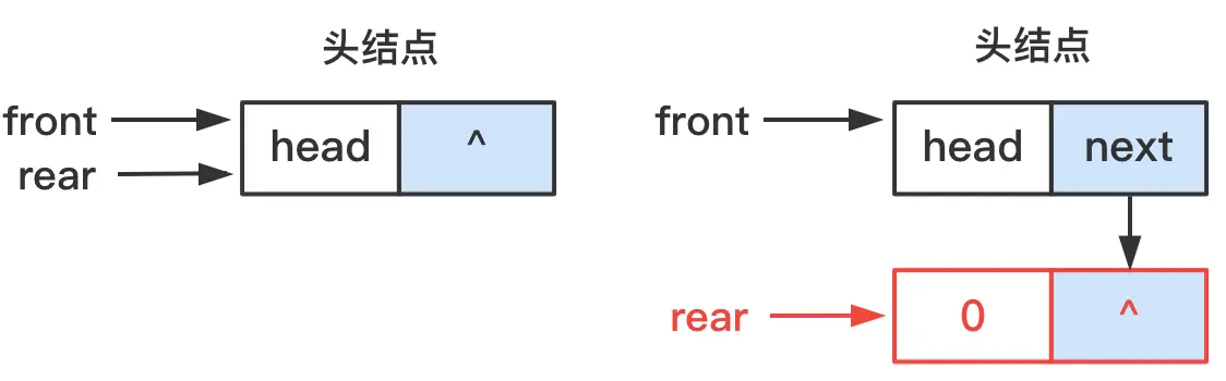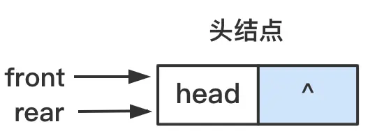 头结点,front和rear指针指向头结点。头结点的概念和之前的链表是一样的,没有什么具体的含义,头结点的next指针指向链表的第一个结点。