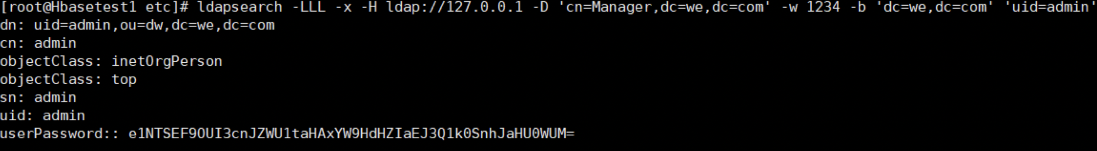 ldapsearch -LLL -x -H ldap://127.0.0.1 -D 'cn=Manager,dc=we,dc=com' -w 1234 -b 'dc=we,dc=com' 'uid=admin'