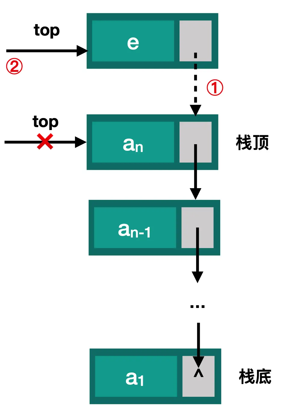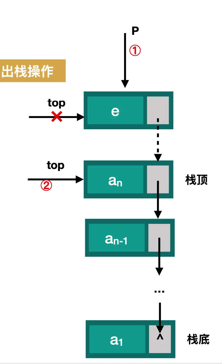 弹栈操作需要将top指针重新定位,还要将出栈结点释放,将值带回: