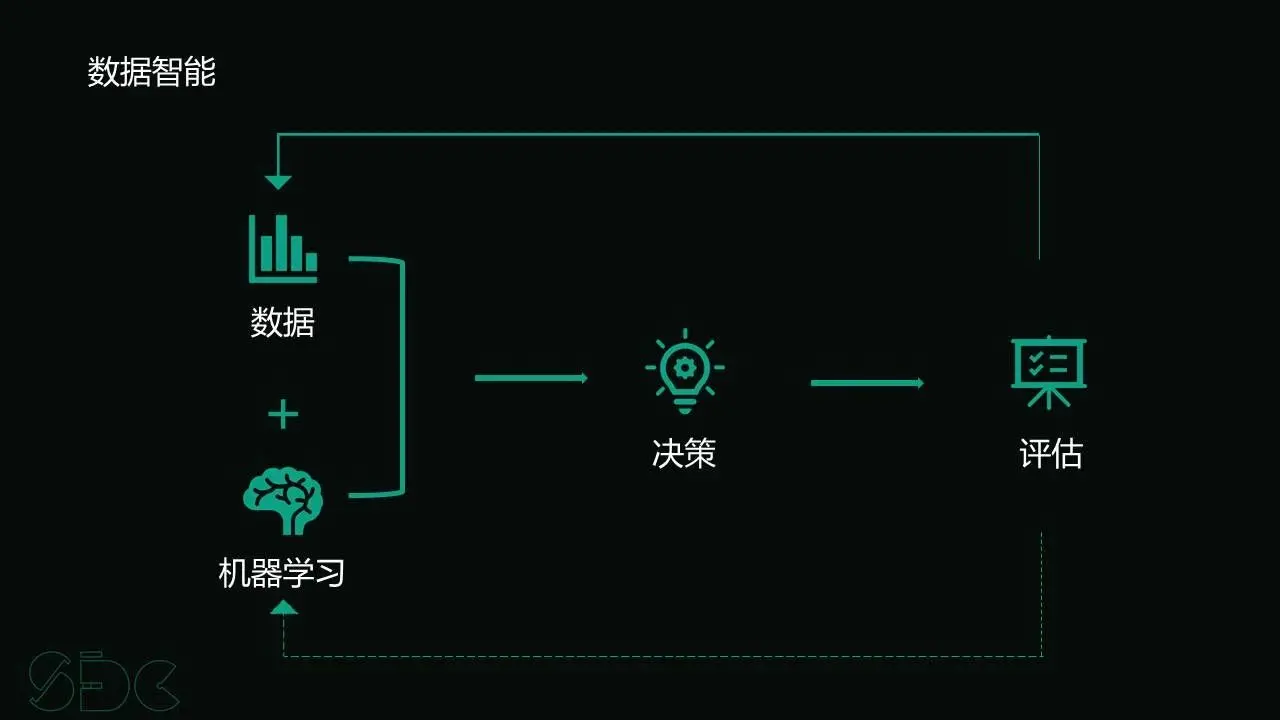 通过关键词来阐述数据智能的概念:数据智能是使用机器学习的方法,从海量数据中进行挖掘,提取出对业务有帮助的决策,目的是预测和决策,而非分析或者展示;并且这些决策的效果能通过一些指标进行评估,所以效果评估是数据智能中的重要一环;最终的评估结果又能作为数据源参与到下一次的策略迭代中,从而使整个数据智能形成一个闭环。