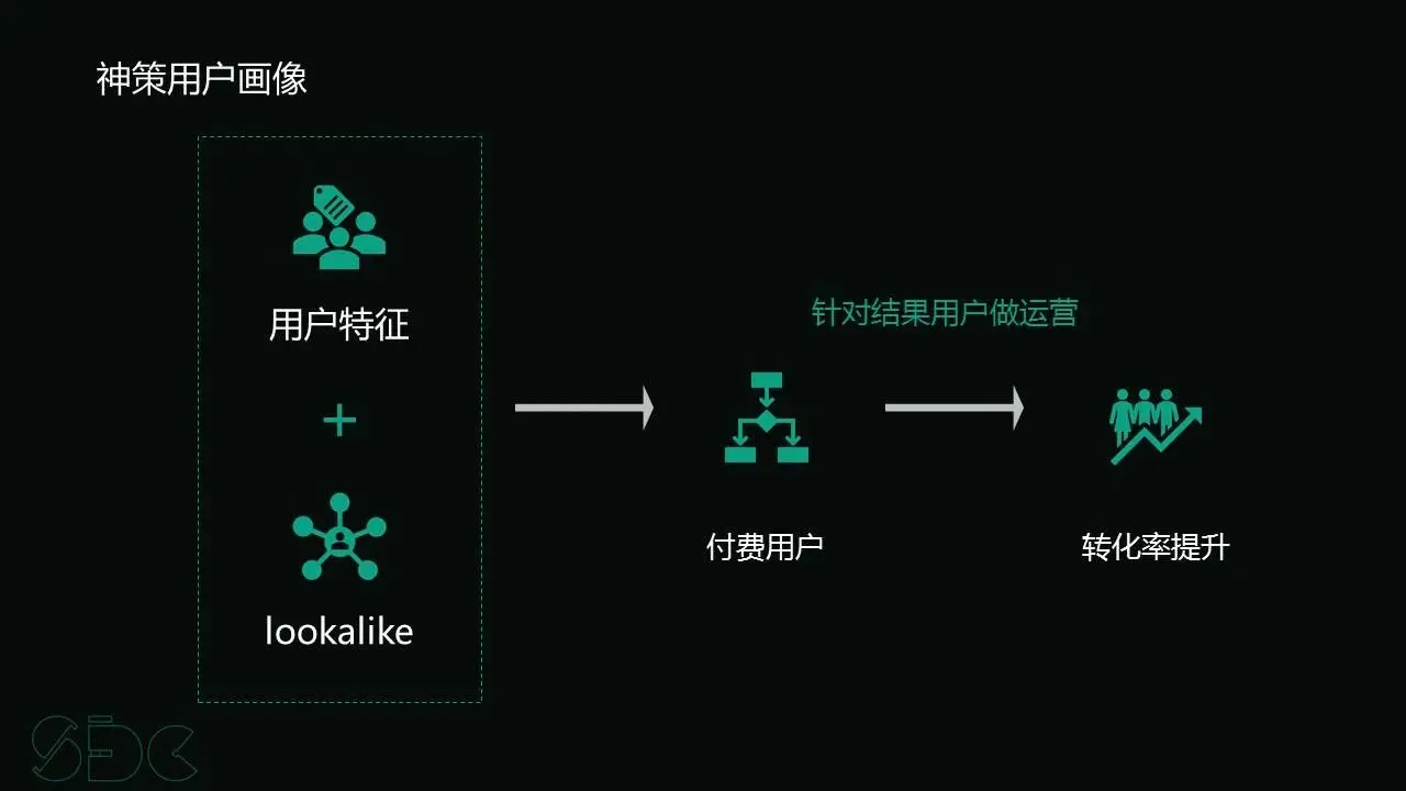 lookalike 功能是神策数据的优化,它是神策用户画像中一个把组织训练数据和模型训练整合的功能模块,通过用户特征和 lookalike 两大工作模块得到付费用户的预测结果,最终针对这一批用户做运营,提升转化率。