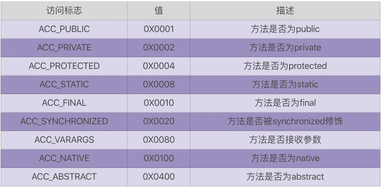 方法结构有:方法的访问标志,指向方法名,指向方法类型