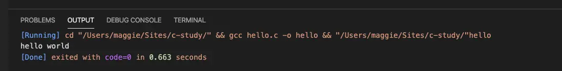 [Running] cd "/Users/maggie/Sites/c-study/" && gcc hello.c -o hello && "/Users/maggie/Sites/c-study/"hello