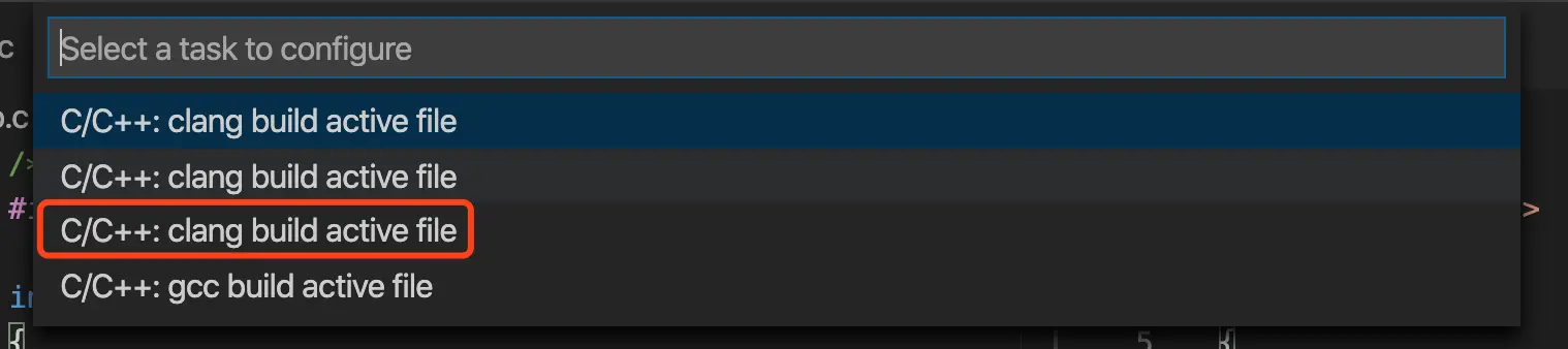 如果没有可选项的用户,点击IDE上方菜单,Terminal-> Configure Tasks-> 选择 C/C++:clang build active file