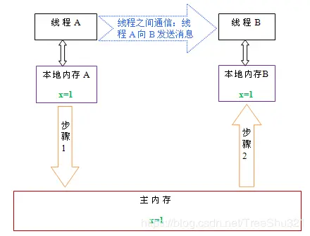 - 线程A在执行时,把更新后的x值(假设值为1)临时存放在自己的本地内存A中。当线程A和线程B需要通信时,线程A首先会把自己本地内存中修改后的x值刷新到主内存中,此时主内存中的x值变为了1。