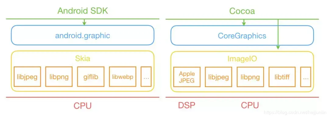 两个平台在导入第三方编解码库时,都多少对他们进行了一些修改,比如 Android 对 libjpeg 等进行的调整以更好的控制内存,iOS 对 libpng 进行了修改以支持 APNG,并增加了多线程编解码的特性。除此之外,iOS 专门针对 JPEG 的编解码开发了 AppleJPEG.framework,实现了性能更高的硬编码和硬解码,只有当硬编码解码失败时,libjpeg 才会被用到。