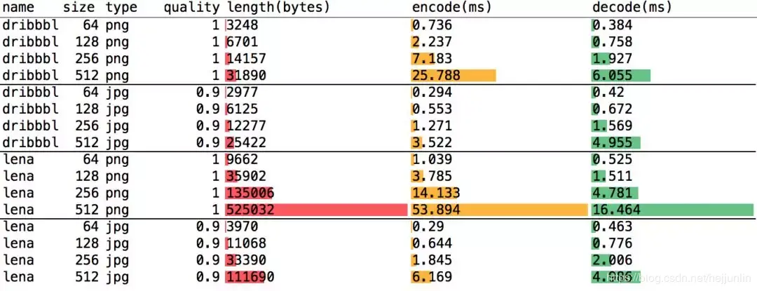 可以看到,在编解码图形类型(颜色少、细节少)的图片时,PNG 和 JPEG 差距并不大;但是对于照片类型(颜色和细节丰富)的图片来说,PNG 在文件体积、编解码速度上都差 JPEG 不少了。