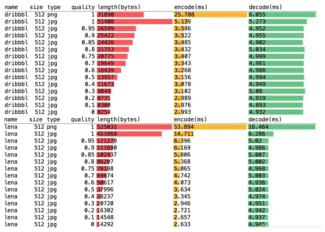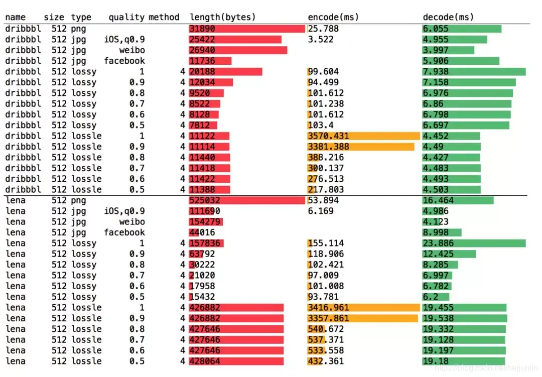 由于 WebP 测试数据较多,这里只贴一下 512x512 大小的一部分测试结果,感兴趣的可以看文章结尾处的 Excel 附件。