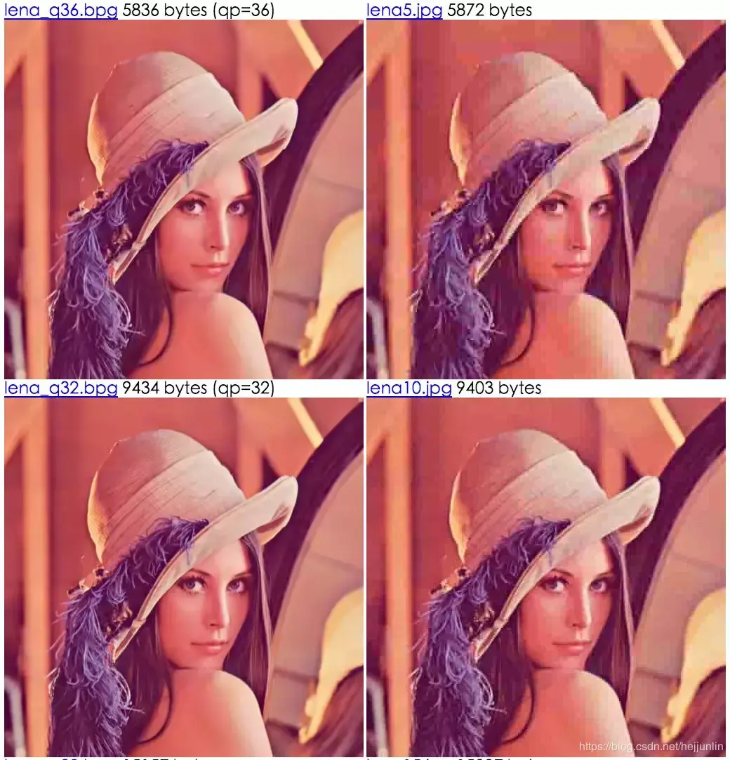 BPG 是目前已知最优秀的有损压缩格式了,它能在相同质量下比 JPEG 减少 50% 的体积。下面是经典的 Lena 图的对比,你也可以在这里看到大量其他图片的 BPG、JPEG、JPEG2000、JPEG-XR、WebP 压缩效果的在线对比,效果非常明显。