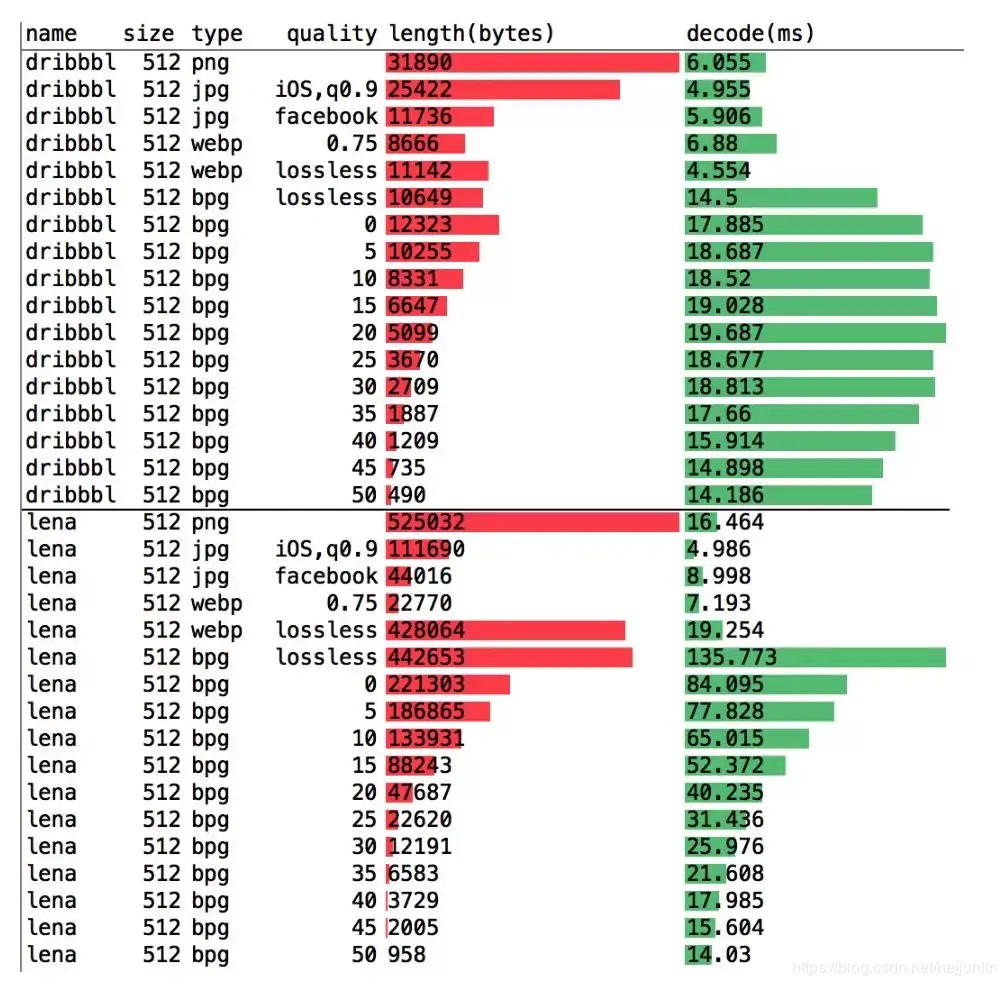 由于 bpg 编码时间太长,我并没有将数据放到表格里。可以看到相同质量下,BPG 的解码速度还是差 JPEG 太多,大约慢了 3~5 倍。目前来说,BPG 适用于那些对流量非常敏感,但对解码时间不敏感的地方。从网上的新闻来看,手机淘宝和手机QQ都已经有所尝试,但不清楚他们是否对 BPG 解码进行了优化。