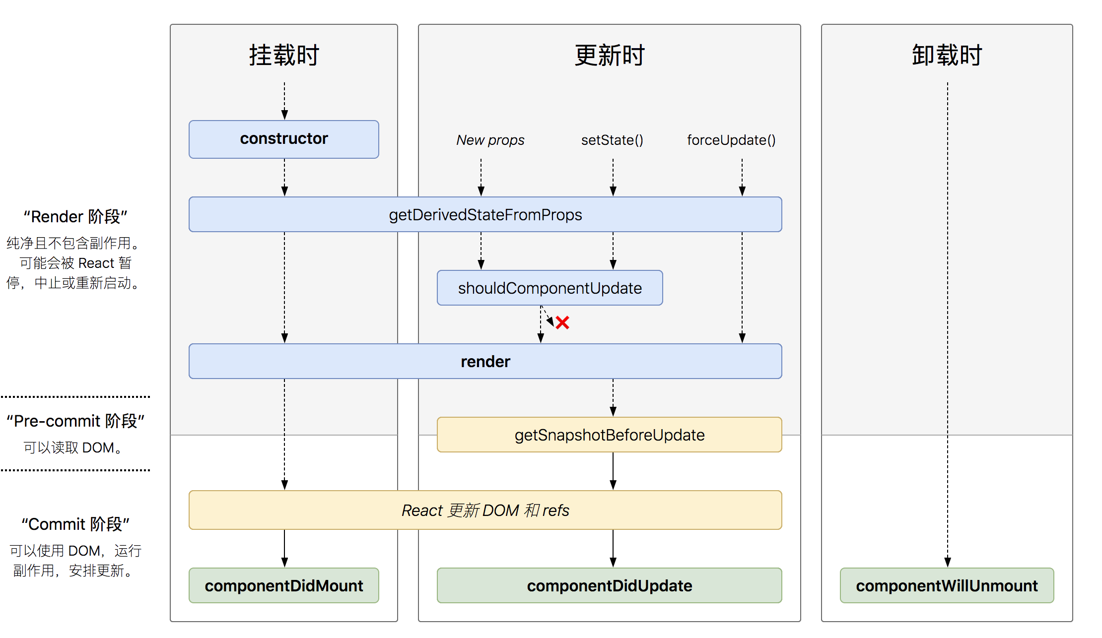 更新 当组件的 props 或 state 发生变化时会触发更新。组件更新的生命周期调用顺序如下:
