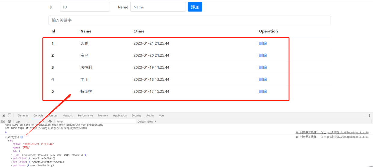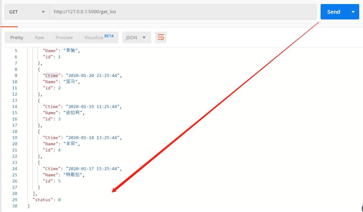 {'id': 4, 'Name': '丰田', 'Ctime': '2020-01-18 13:25:44'},