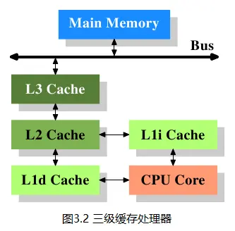 引入缓存不久后,系统就变得更加复杂。缓存与主存的速度差异继续增加,到一个点后,又增加了另外一级缓存,这级缓存比一级缓存更大、更慢。因为经济原因,只增加一级缓存大小不可行。现在,甚至有三级缓存的机器也常态化了。三级缓存处理器如图3.2。随着单个CPU中的核数增加,未来缓存的级次可能也会更多。