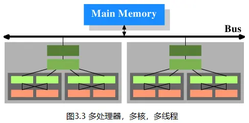 图中我们有两个处理器,每个处理器有两个核,每个核有两个线程。线程共享一级缓存。CPU的所有核共享高级次缓存。两个处理器(浅灰色的两个大框)不会共享任何缓存。这些信息很重要,尤其是在我们讨论缓存对多进程与多线程应用的影响的时候。