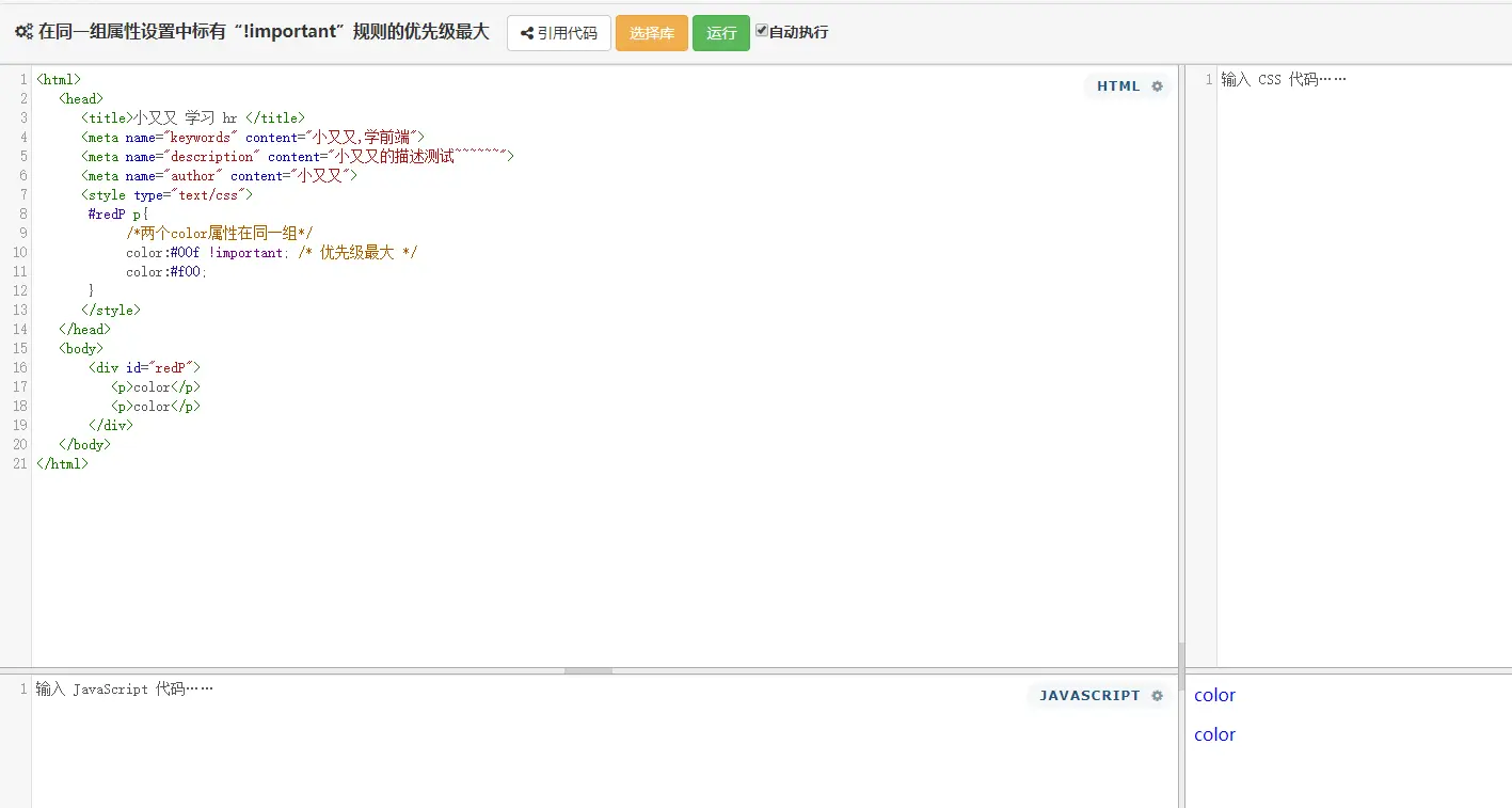 若同时插有 !important,则再利用规则 3、4 判断优先级。