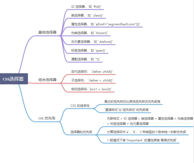- 内联样式 > ID 选择器 > 类选择器 = 属性选择器 = 伪类选择器 > 标签选择器 = 伪元素选择器