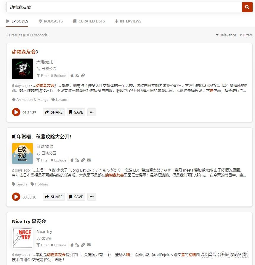 结果显示 Listen Notes 共找到了 21 期和「动物森友会」相关的节目,其发布时间从一个月前到两天前都有收录。从高亮效果来看,会同时搜索题目和 shownote 内容,这也是比 Google Podcast 更全的主要原因。