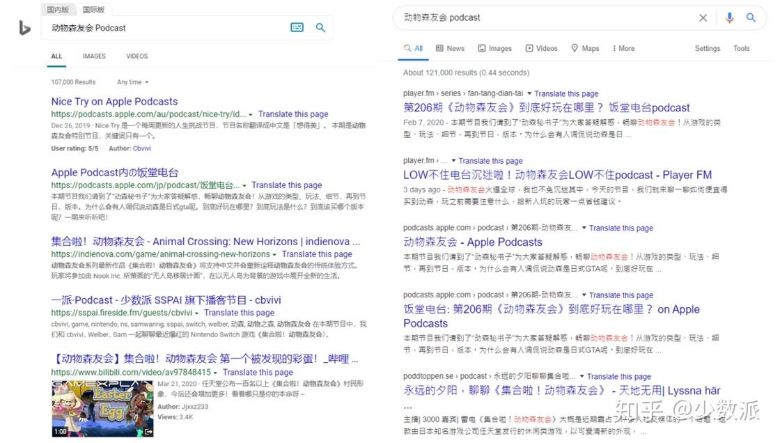 在常用的搜索引擎中如果想找和某个主题相关的播客,可能最好的方法就是用「关键词+podcast」进行搜索。下图展示了使用 Bing 国际版(左)和 Google(右)搜索呈现的内容,其中部分结果指向苹果播客部分则指向了播客主页。虽然费点力气总可以找到收听方式,但使用体验并不好。
