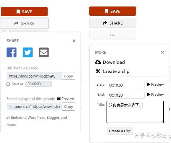 除了分享完整节目以外,Listen Notes 还可以很方便的创建内容片段。听到有趣的部分只需要输入起止时间再附上走心评语就可以通过链接一并分享给朋友。