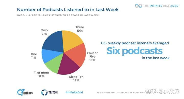今年 3 月 Edison Research 发布的一项报告 The Infinite Dial 2020 显示:在美国,人们的播客意识和消费正在持续上升。