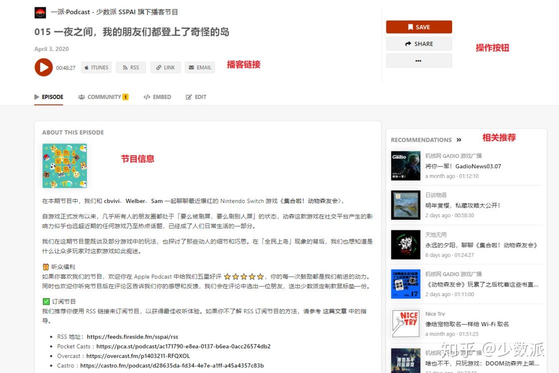 展示内容包括节目与播客名,作者和播客相关链接(RSS 地址、主页和邮箱等),节目 shownote 和标签,还有包括播放、分享与保存在内的操作按钮。