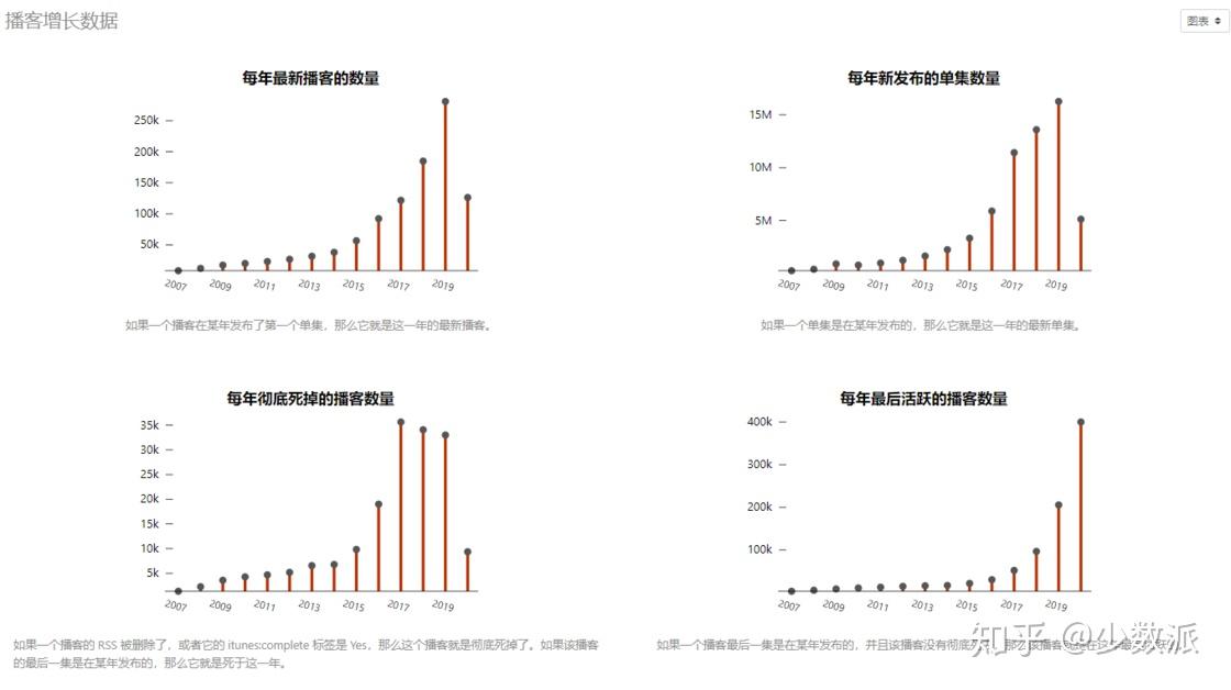 网站还有全球播客数据的可视化展示页面,通过它可以看到全球播客变化趋势以及不同类别和托管商的播客数量。
