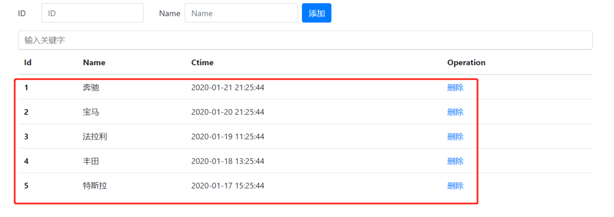 {'id': 4, 'Name': '丰田', 'Ctime': '2020-01-18 13:25:44'},