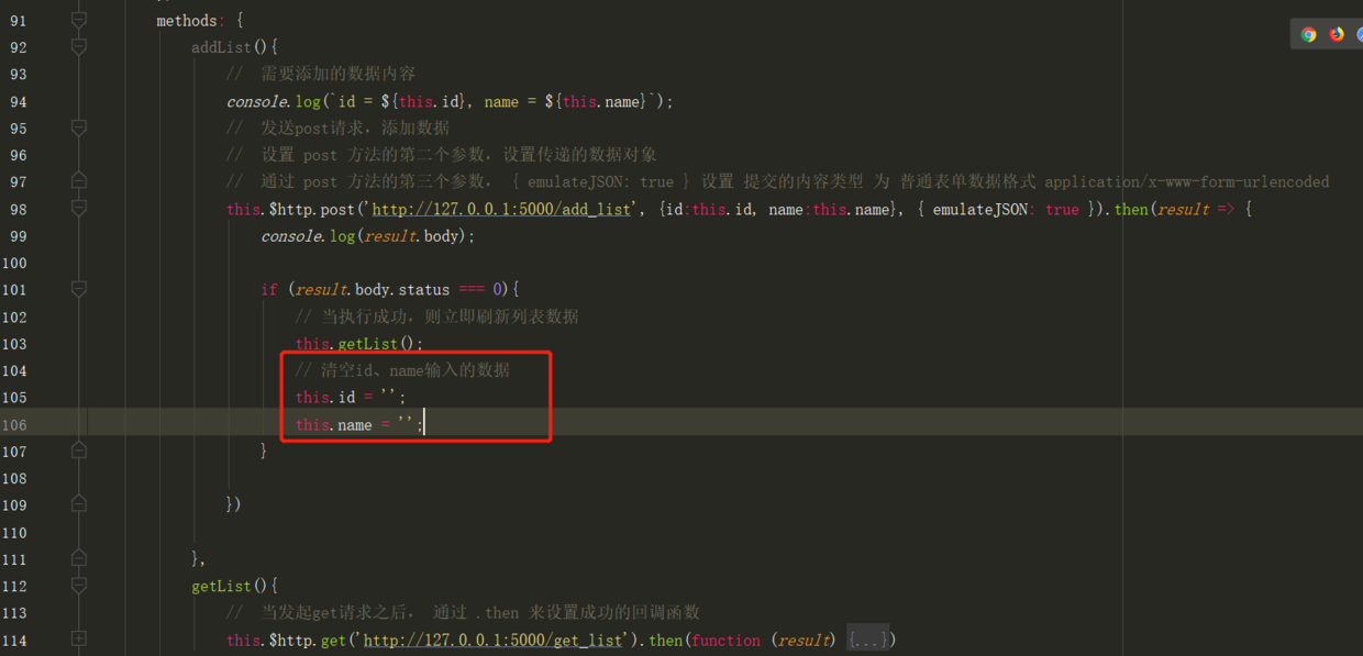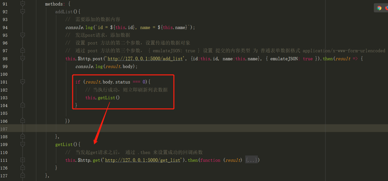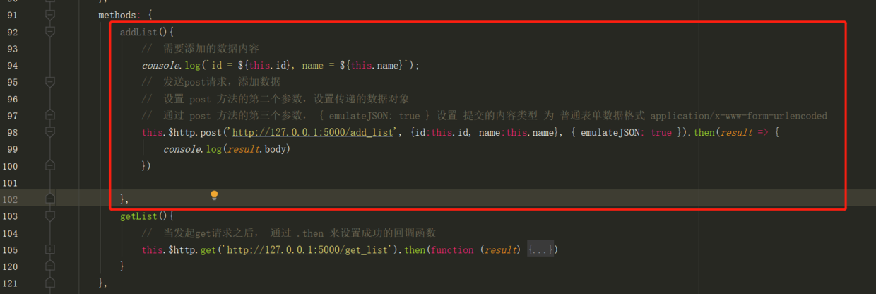 this.$http.post('http://127.0.0.1:5000/add_list', {id:this.id, name:this.name}, { emulateJSON: true }).then(result => {