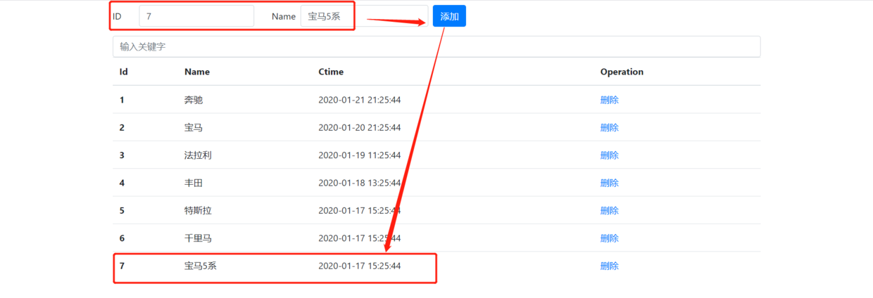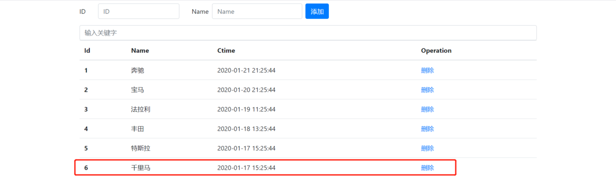 {'id': 5, 'Name': '特斯拉', 'Ctime': '2020-01-17 15:25:44'},
