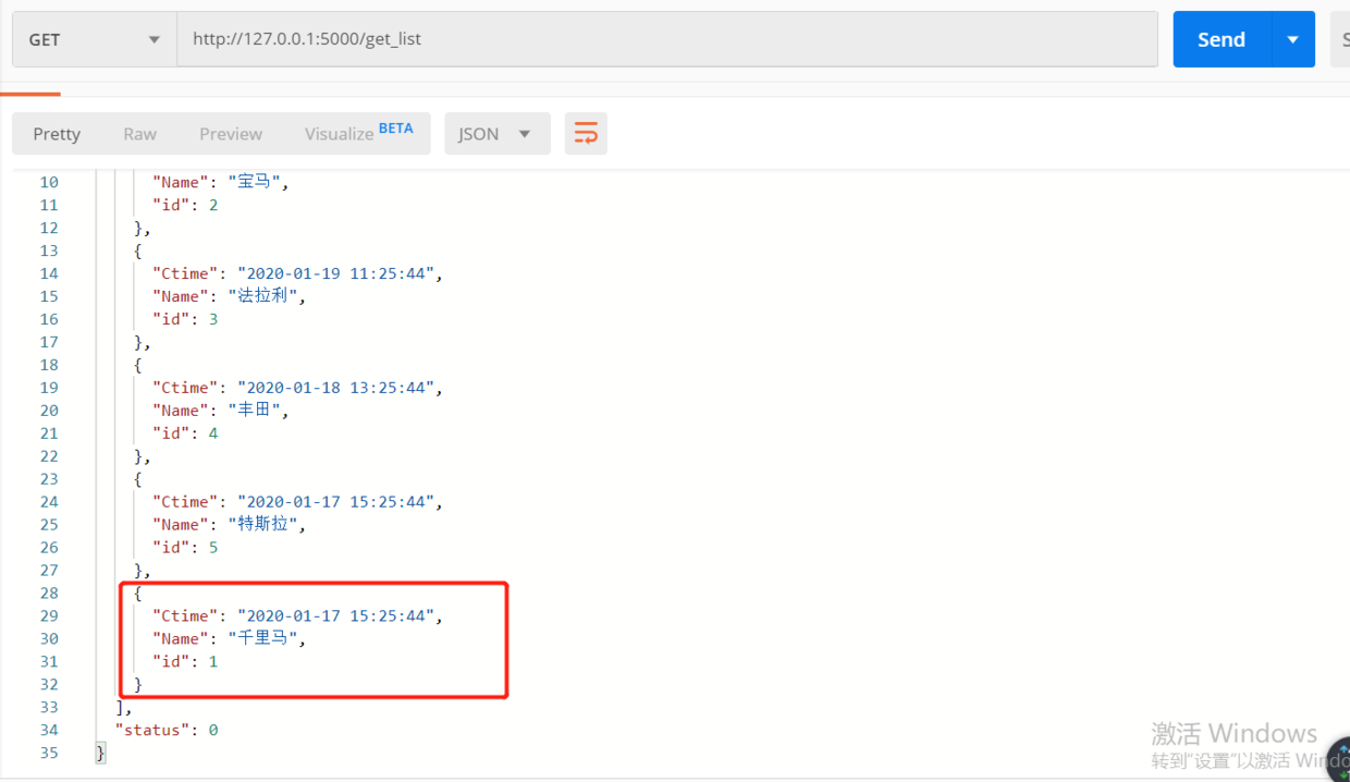 {'id': 2, 'Name': '宝马', 'Ctime': '2020-01-20 21:25:44'},