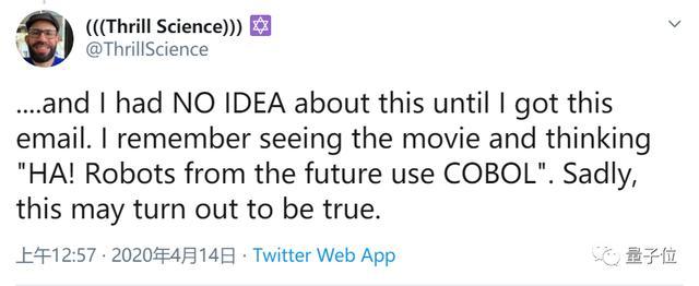 今天,Virtual Airwaves首席技术官Erlang在推特上表示,自己写的COBOL代码也出现了在《终结者》电影里。