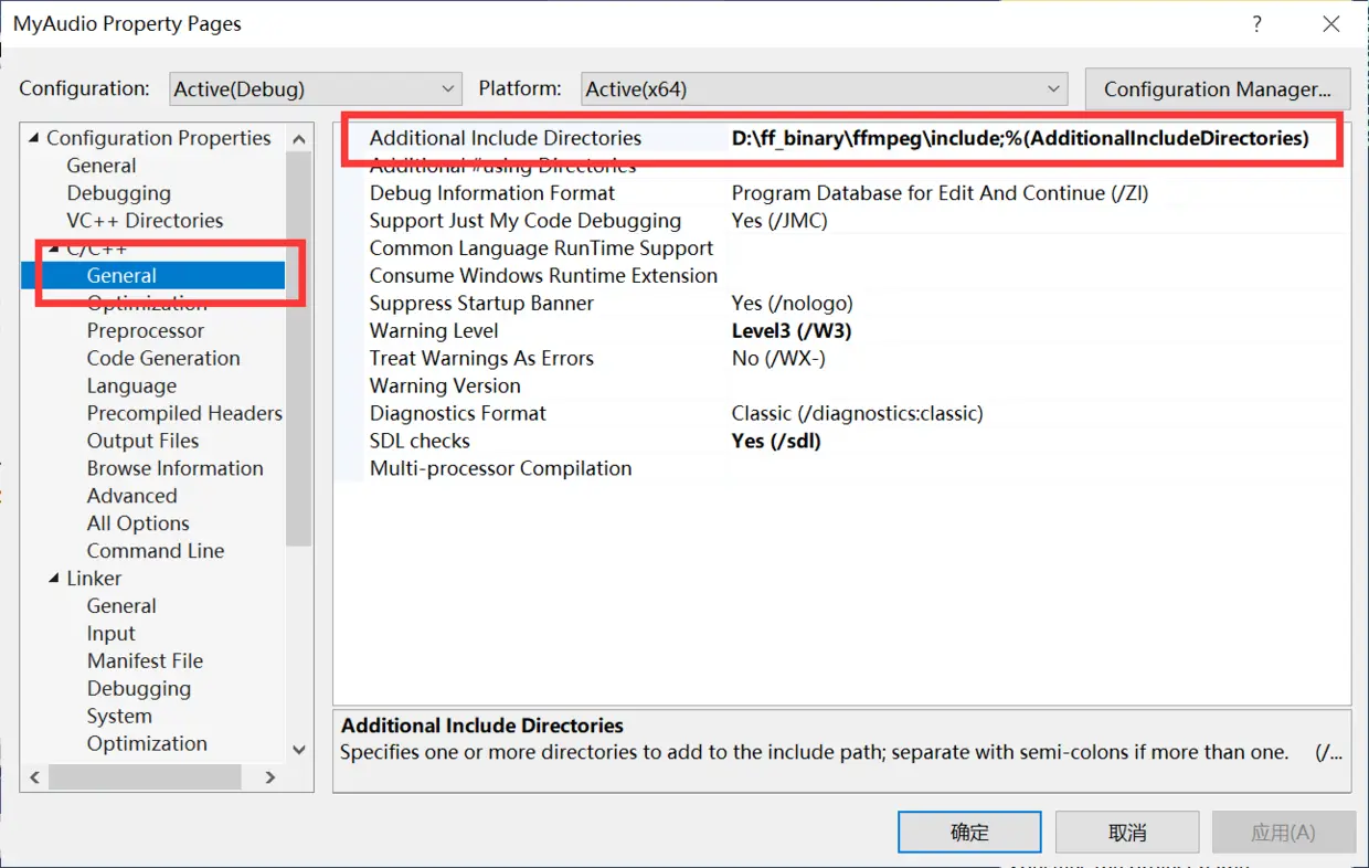 第四步,修改 C++/General 中的 Additional Include Directories
