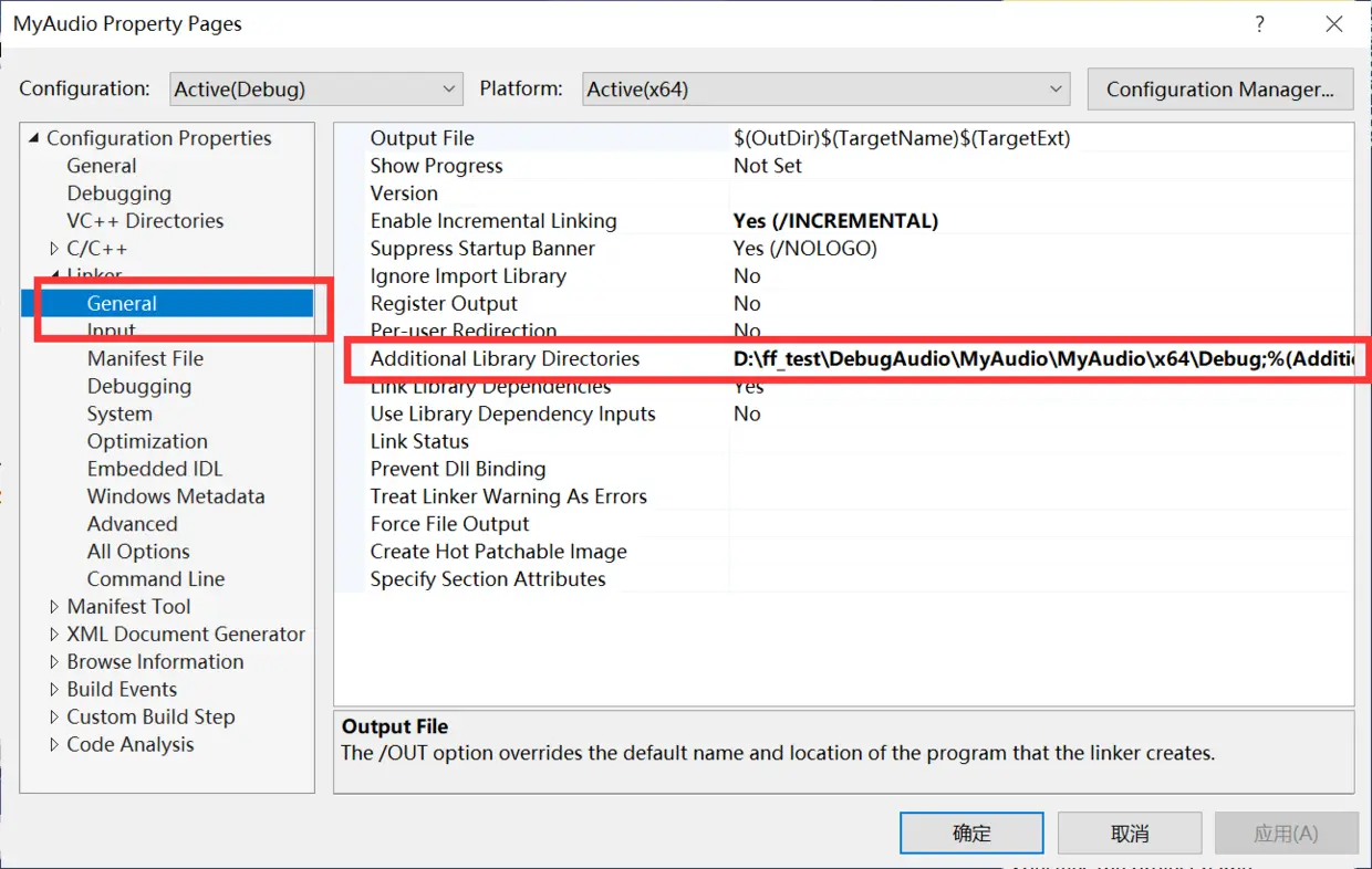 在 Additional Library Directories 中添加 ffmpeg 库路径。这样就将ffmpeg 库文件路径设置好了。