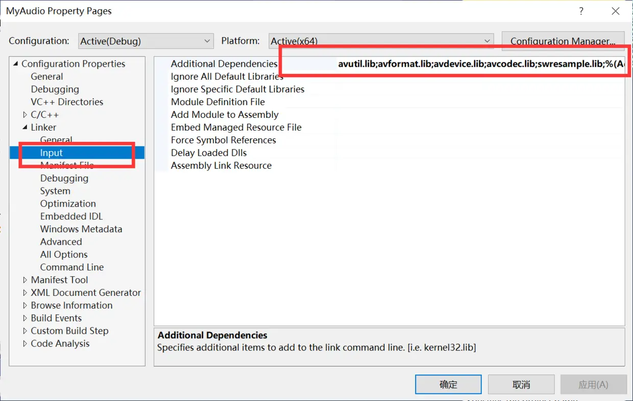 在我这个例子中,由于我用到了音频设备,所以要引入 avdevice,我要对采集到的音频进行编码,所以还需要 avcodec等。因此我的工程中需要加入以下几个库: avutil, avformat, avdevice, avcodec 和 swresample。下面我们就看看该如何设置吧。
