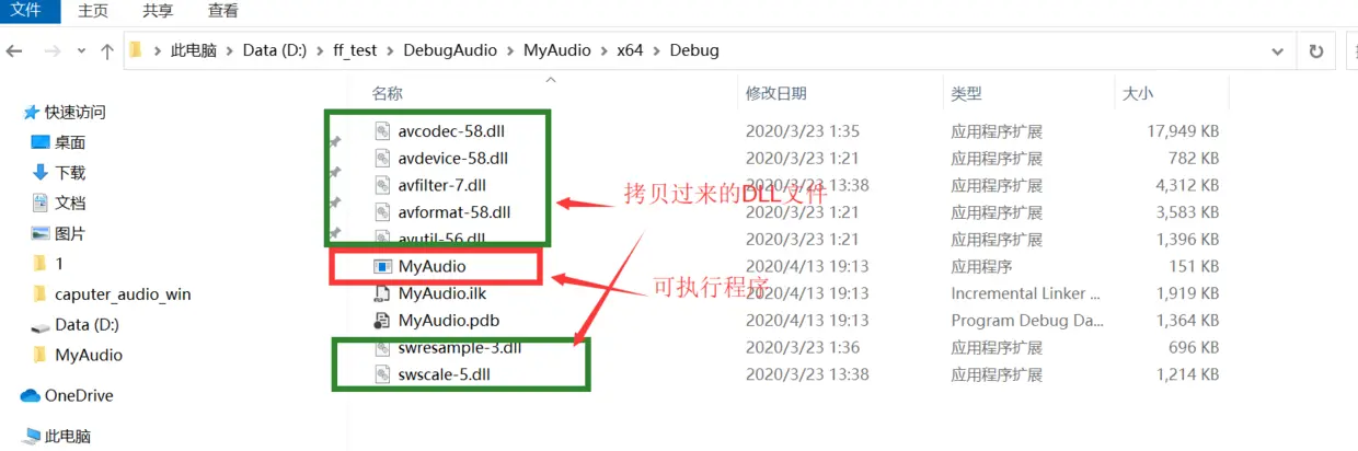 最后一步就是将编译好的 ffmpeg 库文件放到编译后的可执行文件目录下就好了。直接上图了: