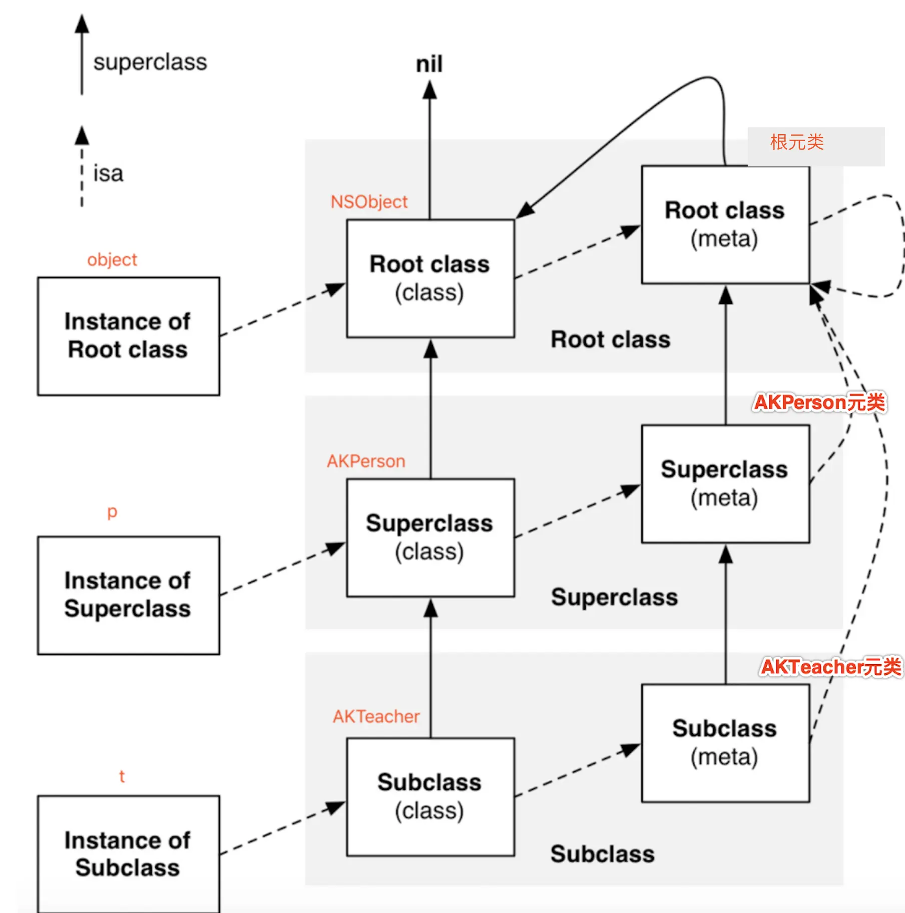 NSObject的元类(根元类)与NSObject类不相等,NSObject元类的父类(就是NSObject类)与`NSObject类``相等——YESNSObject的元类(根元类)与NSObject类不相等——NOAKPerson的元类与AKPerson类不相等,AKPerson元类的父类(根元类)与AKPerson类不相等——NOAKPerson的元类与AKPerson类不相等——NO
