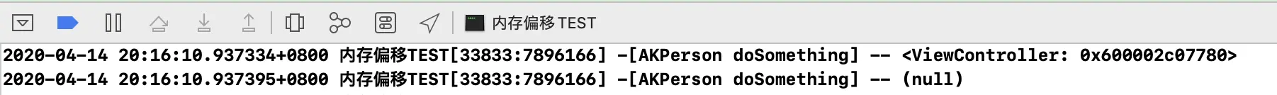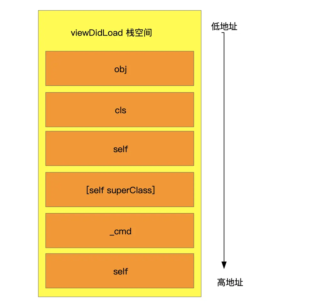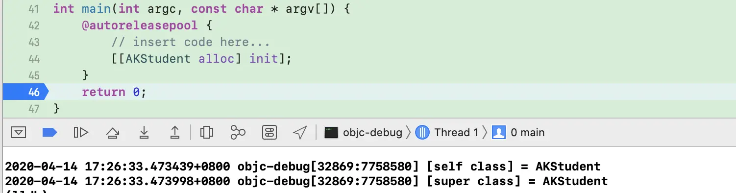 self.name所拿到的变量,就是图中cls下面的那8个字节,也就是当前方法的消息接受者self(ViewController实例对象),因此打印的结果是<ViewController: 0x7fce43e08aa0>。