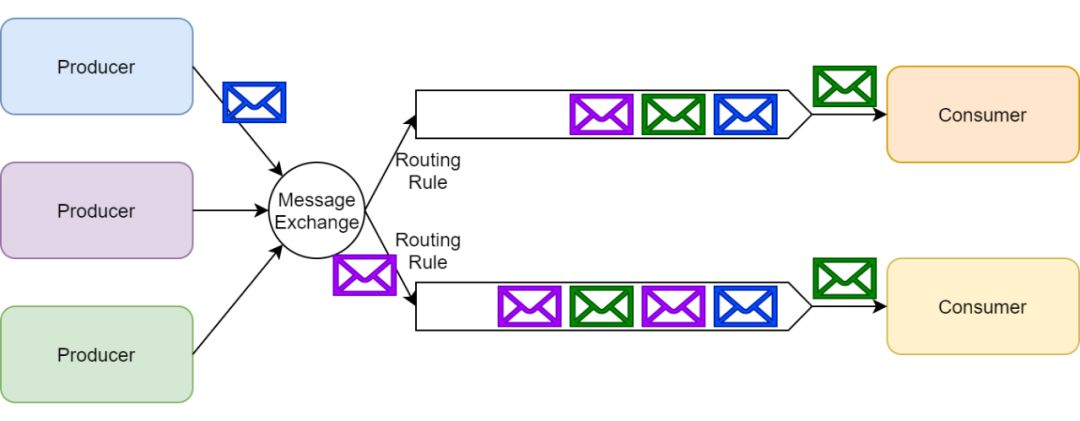 每一个订阅了交换器的消费者都会创建一个队列;然后消息交换器会把生产的消息放入队列以供消费者消费。消息交换器也可以基于各种路由规则为一些订阅者过滤消息。