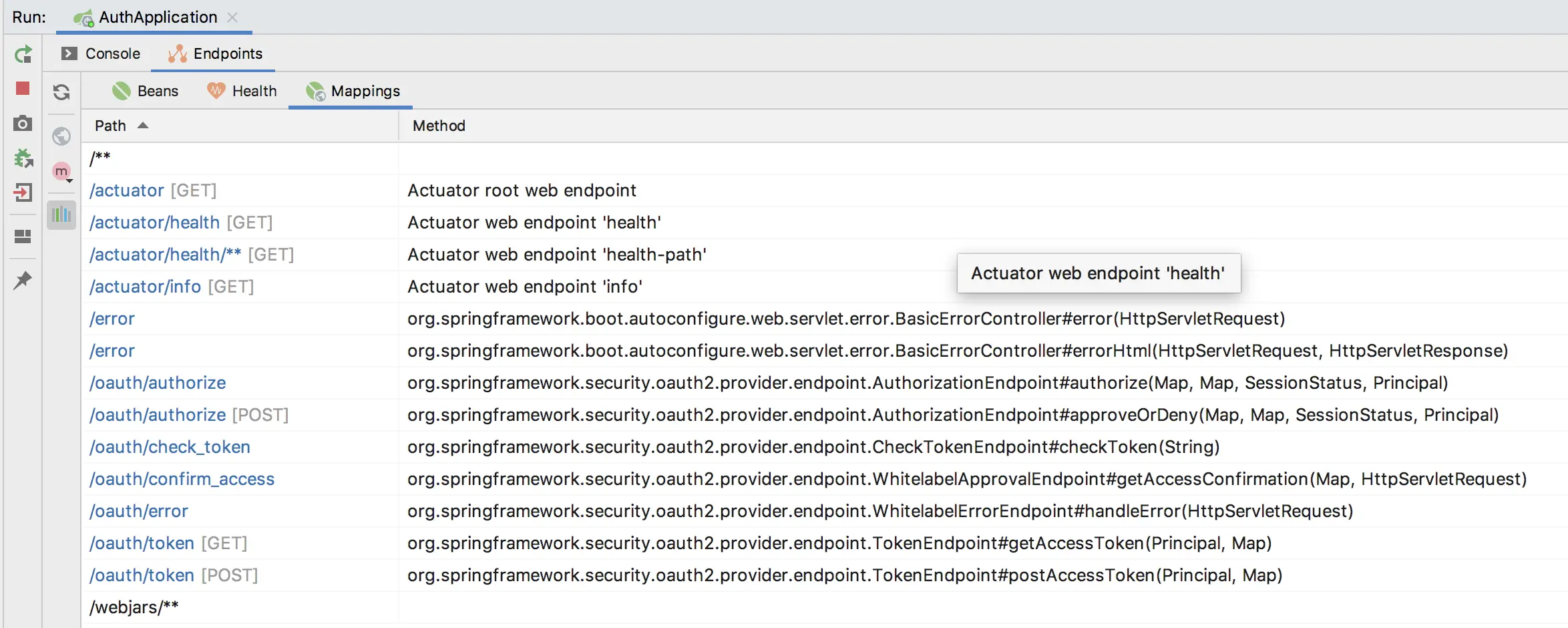 以授权码模式为例,当我们启动 auth-server 之后,在 IntelliJ IDEA 中,我们可以看到项目暴露出来的接口: