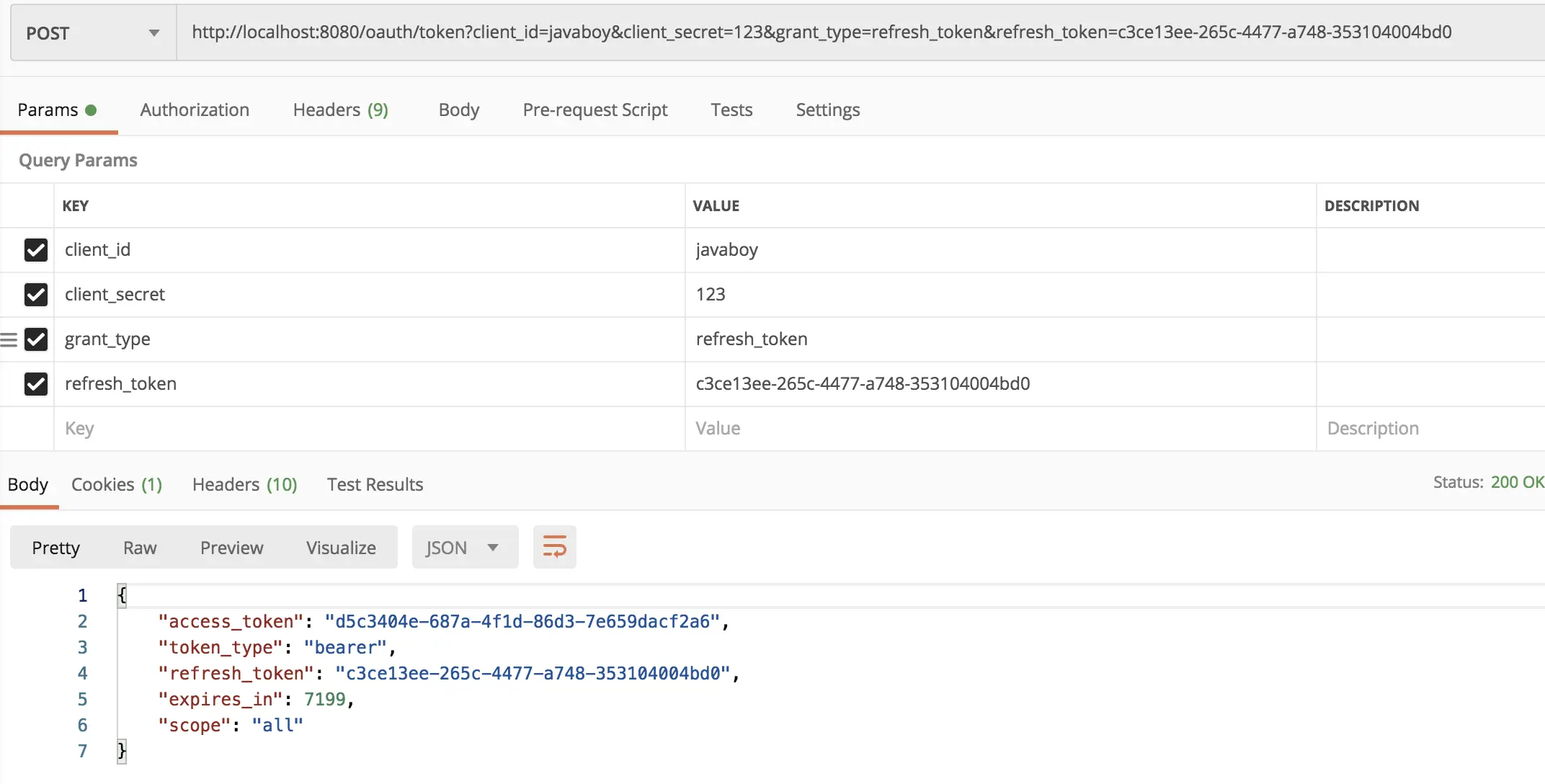 这段代码跟前面的都差不多,就是请求参数不一样而已,参数 grant_type 的值为 client_credentials。其他都一样,我就不再赘述了。