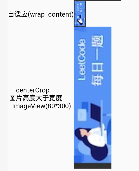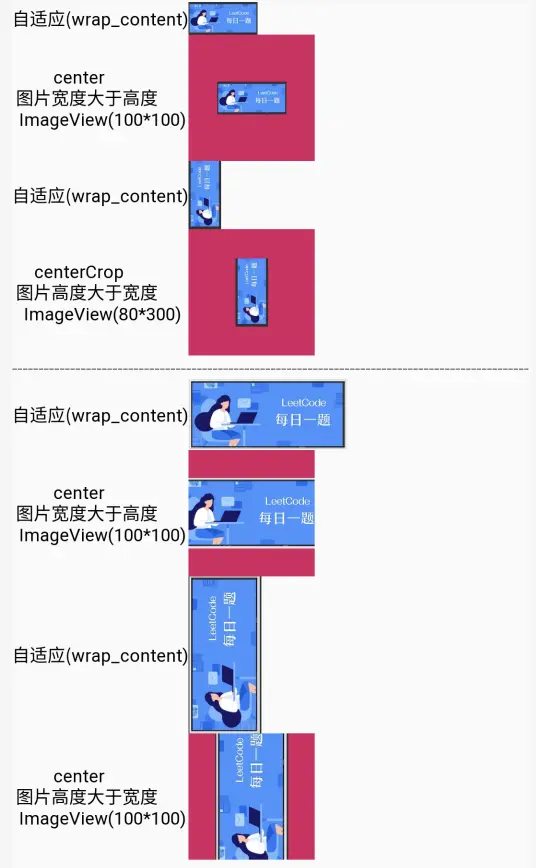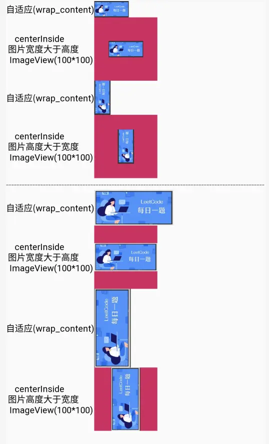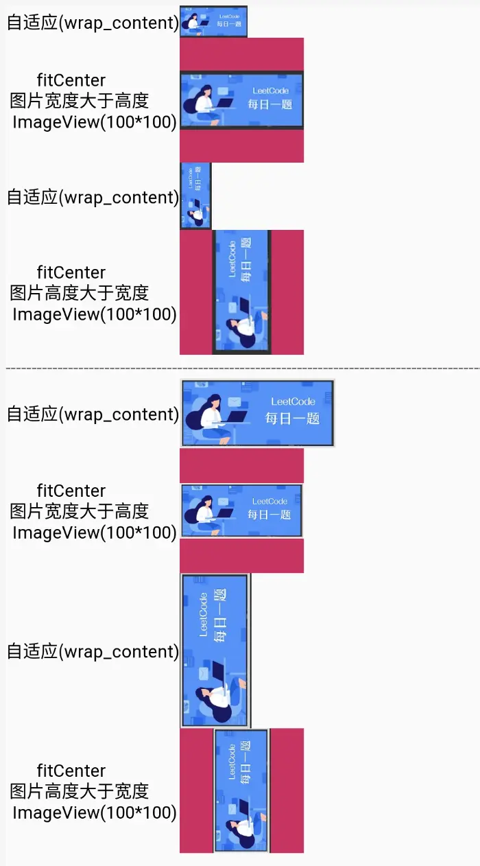 PS:显示图片的所有内容意思就是,把图片上所有东西都显示出来,有些放大/缩小只是放大/缩小一部分内容,比如放大上面那个图片的打电脑的女生,然后放大到充满ImageView,但是我们就看不到LeetCode这段文字了,这样就不能显示图片的所有内容。