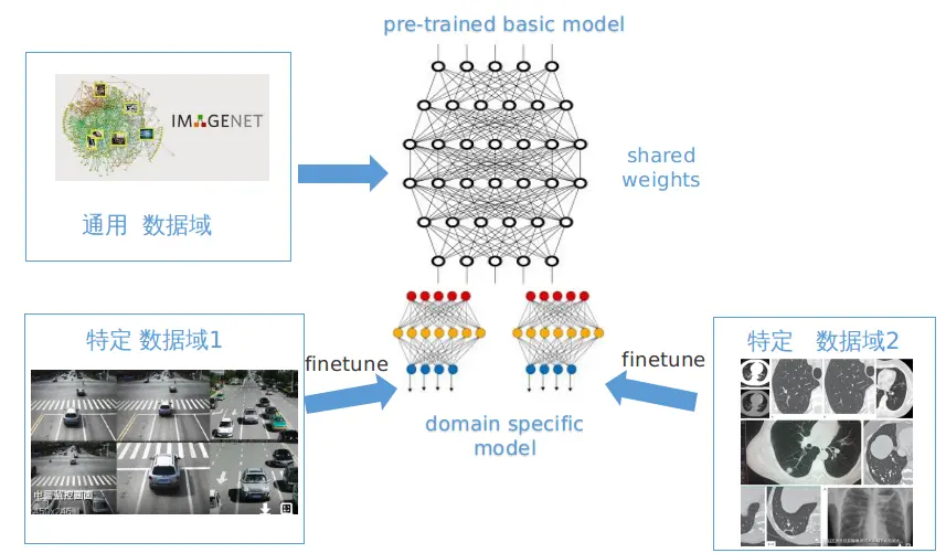 这种方法已经被广泛使用。获得一定量的标注数据,然后基于一个基础网络进行微调 。这个基础网络是通过含有丰富标签的大规模数据集获得的,比如imagenet,我们的淘宝电商数据,称为通用数据域。然后在特定的数据域上进行训练。训练时,会固定基础网络部分的参数,对领域特定的网络参数进行训练(这里有很多训练的trick,包括设置固定层和学习率等)。如下图,这个方法可以相对较快,依赖数据量也不必太多,效果还可以。
