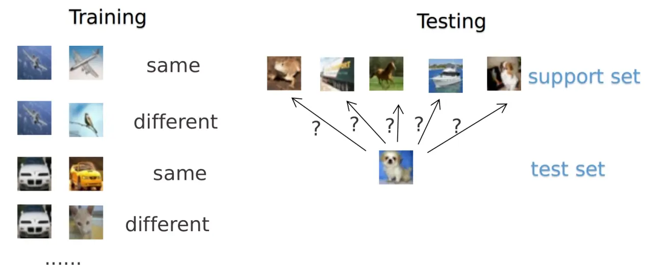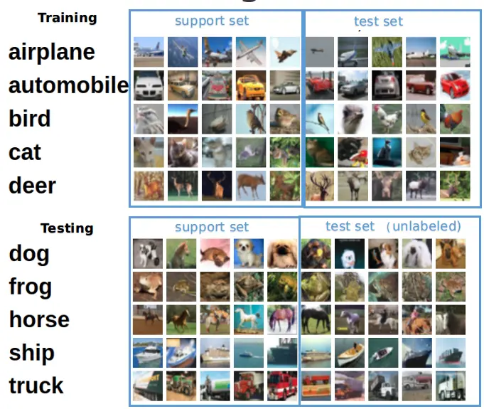 - 训练过程中有从未见过的新类,只能借助每类少数几个标注样本;