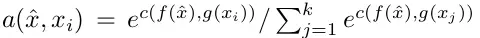上述的attention具体是,对训练样本xi和测试样本x^分别进行embedding,然后求内积(cosine),这就是文章提出的"matching",然后输入到一个softmax中,公式如公式2),其中c是cosine距离。其中两个embedding的模型是share的,比如用CNN。这个a是和度量学习(metric learning)相关的,对于待分类的样本x, 让其和那些标签为y的样本对齐,和其它的不对齐,这种loss其实就是和NCA,triplet loss和margin nearest neighbor相关的。