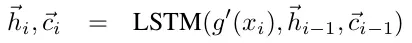 关于g 的优化。上述虽然是在整个支持集样本上做分类,但用来做cosine距离计算的embedding 的获得是互相独立的,因此文章把对支持集样本的embedding改为g(xi, S), 这当比如xj十分接近xi时改变g函数是有用的。文章用了双向LSTM,即把S看成一个序列(文章并没有提到这个序列的顺序是怎么生成的,也许是随机的),然后对每个xi进行编码。具体公式如下,其中g'(xi)是原始只依赖自己的embedding,xi通过BiLSTM进行信息互通。