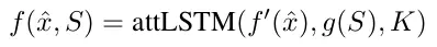 关于f的优化。支持集样本可以用来修改测试样本的embedding模型。这个可以通过一个固定步数的LSTM和对支持集的attention模型来解决, 即如下公式,其中f'(x)是只依赖测试样本自己的特征,作为LSTM的输入(每步不变),K是LSTM的步数,g(S)是支持集的embedding。由此,模型会忽略支持集S中的一些样本。